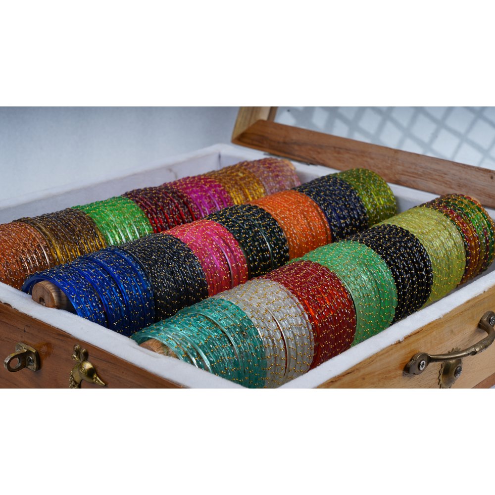 Made with lightweight glass material, these bangles are comfortable to wear for long hours while maintaining a rich and festive appearance. The neatly arranged display also makes it easy to select the perfect color combination for any occasion.