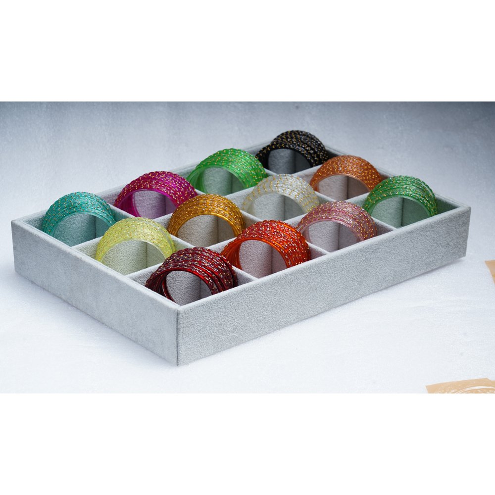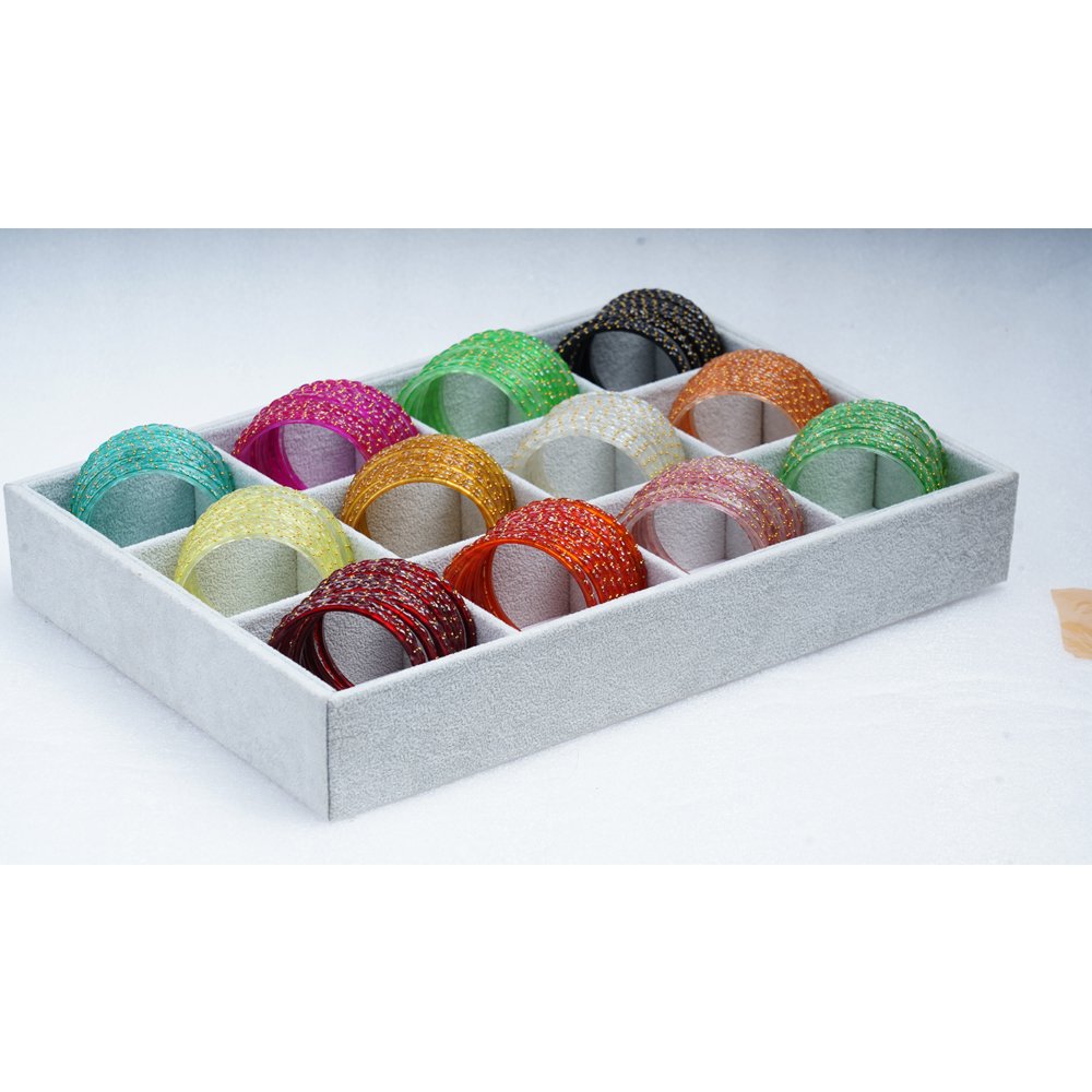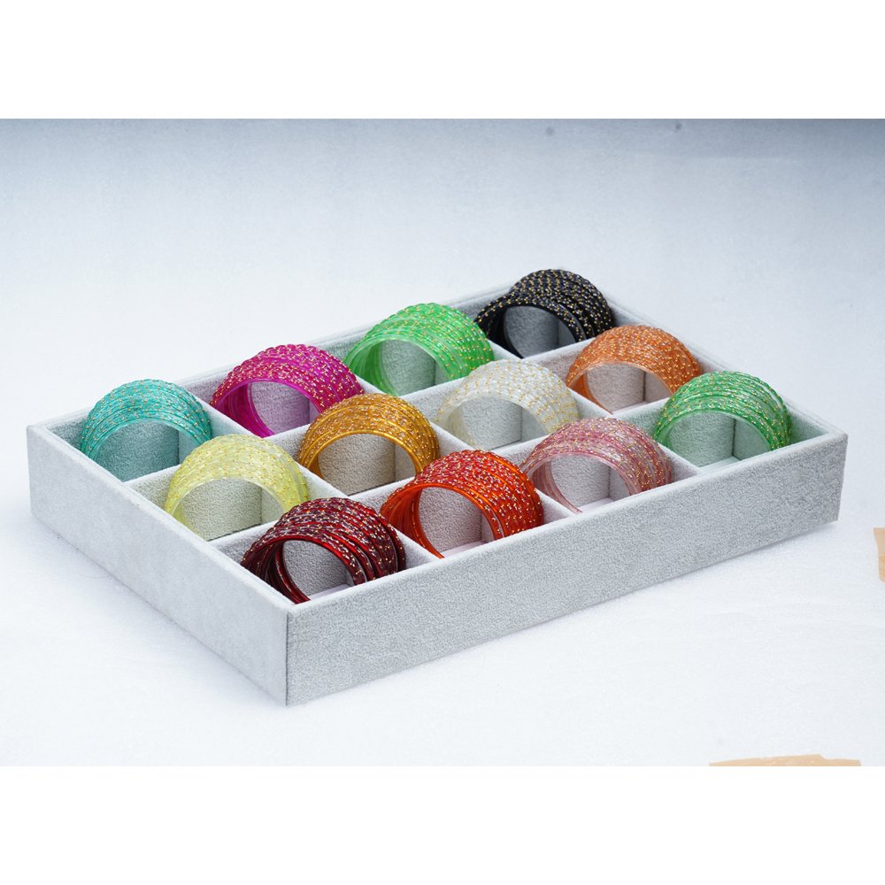 Crafted from high-quality glass material, the bangles are lightweight and comfortable to wear for long hours. The neatly organized tray keeps each set arranged and easy to select according to your outfit.