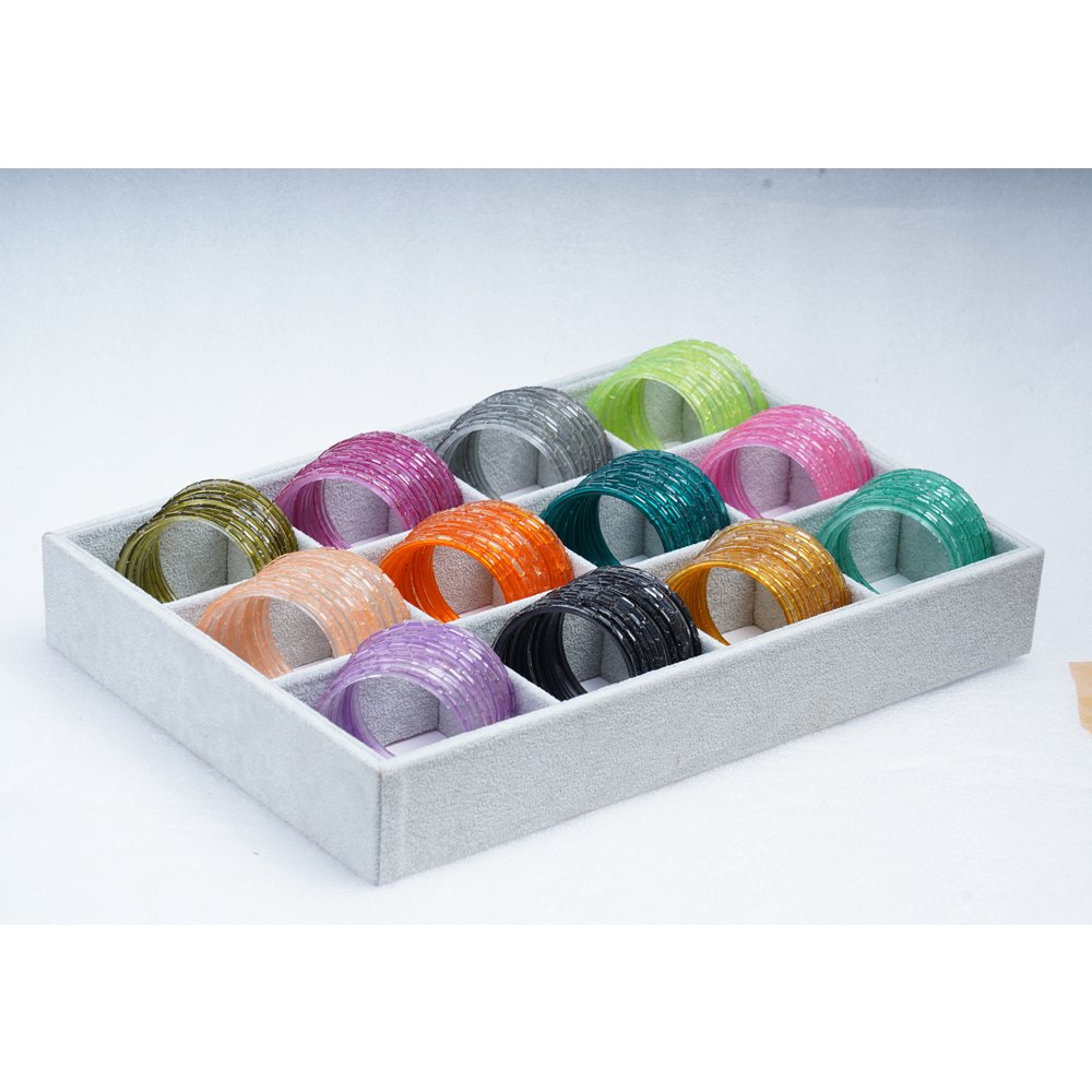 These bangles are crafted from high-quality glass material that is lightweight and comfortable for long wear. The organized storage tray keeps each color set neatly arranged, making it easy to select the perfect combination for weddings, festivals, family functions, or daily wear.